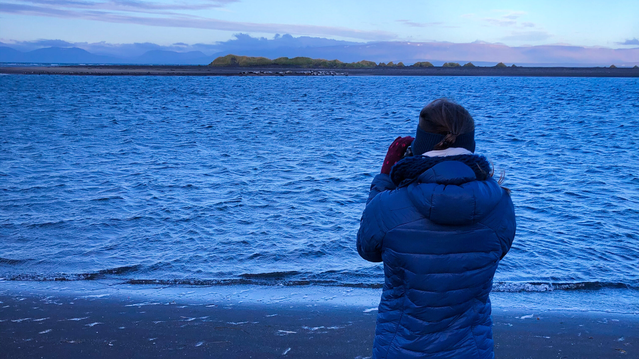Übernachtet haben wir im Ósar Hostel in spektakulärer Lage mit Blick auf den Fjord und die gegenüberliegende Halbinsel Skagi. Von dem weiß gestrichenen alten Bauernhaus, in dem der freundliche Landwirt das gemütliche Hostel betreibt, durch Schafweiden und zwischen ihren Bewohner:innen hindurch, führt ein Weg hinab an den Strand, von dem aus eine weitere Seehundsbank beobachtet werden kann. Die neugierigen Robben tauchen im seichten Wasser zwischen den Ufern und blicken hie und da nach uns aus dem Meer. In völliger Einsamkeit sind wir mit allen Sinnen umgeben von den Geräuschen und Eindrücken der Natur.