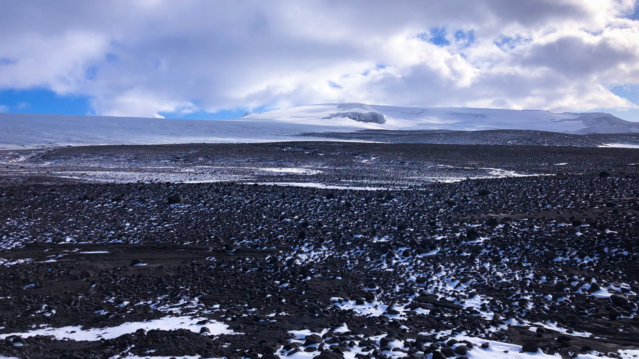 Wenige Kilometer hinter Húsafell zweigt rechts von der Straße 518 die geschotterte F-Road 550 ab, die vorbei am Langjökull-Gletscher nach Süden bis zum Þingvellir-Nationalpark führt. Die Straße ist bei guten Konditionen einfach zu befahren. Kaum haben wir die Asphaltstraße an der Kreuzung verlassen, sind wir mitten in einer wilden, vom Gletscher geprägten Landschaft. Die Straße schlängelt sich durch Felslandschaften und bietet grandiose Ausblicke auf die Ausläufer des Langjökull. Deutlich schneller, als die Navigation prognostizierte, erreichen wir dann das Ende der Straße, die tatsächlich mit dem Eisfeld zusammentrifft.