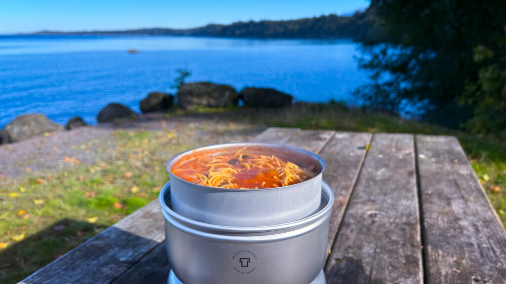 Dank des Sturmkochers haben wir uns auf unserem letzten Roadtrip durch den US-Bundesstaat Washington nicht nur deutlich gesünder und ausgewogener ernährt als auf früheren Reisen, wir hatten auch einige der schönsten Esserlebnisse überhaupt. Darunter ein einsames Pasta-Nachmittagsessen direkt auf einer Bank am Meer mit Blick auf den Pudget Sound und den Mt. Baker. Während wir unsere Nudeln genossen haben, konnten wir spielende Seeotter beobachten. Das geht nicht mal im besten Hafenrestaurant mit Tisch am Wasser. Genauso schön war ein warmes Frühstück in den Bergen, umgeben von uralten Bäumen mitten in einem jahrhundertealten Wald. Der Trangia ist so flexibel und klein, dass er sogar für kürzere Trekkingtouren geeignet ist. Jedenfalls braucht Ihr zum Kochen kaum mehr als einen möglichst ebenerdigen Untergrund (falls kein Tisch zur Verfügung steht, tut es auch der gerade Boden) und Eure Zutaten.