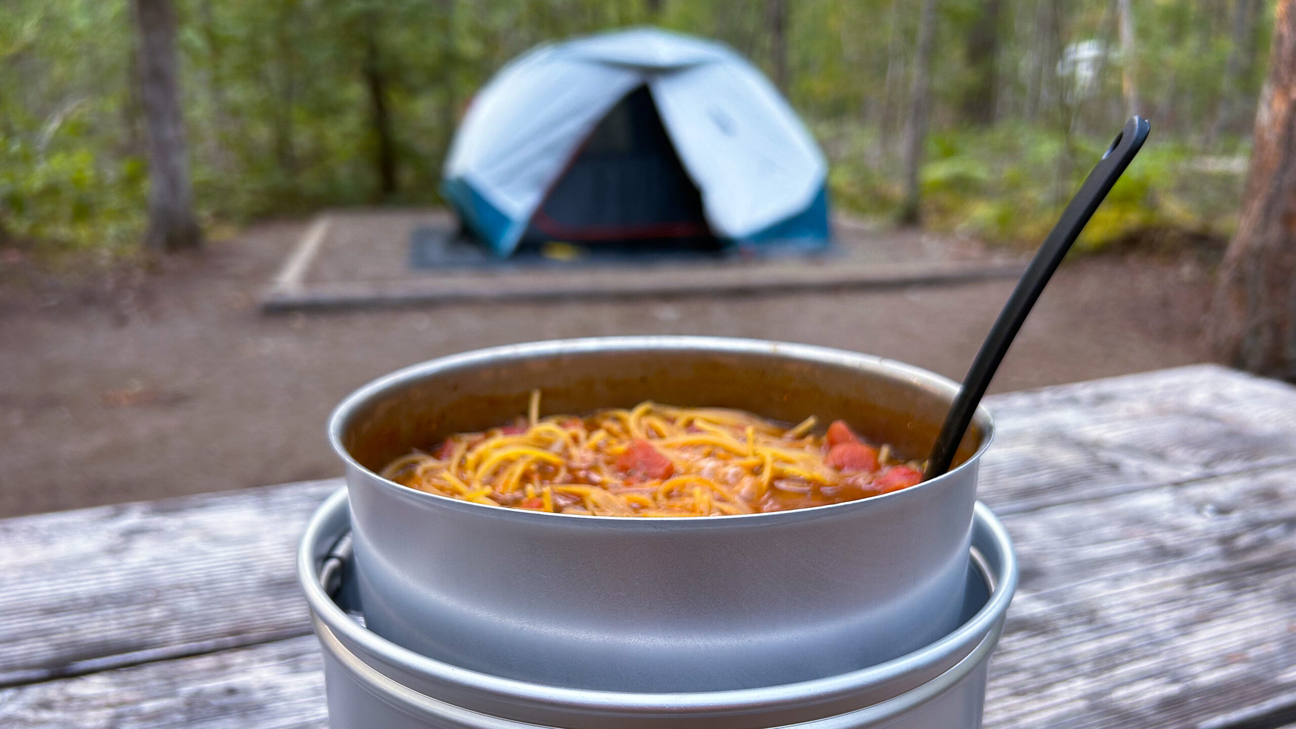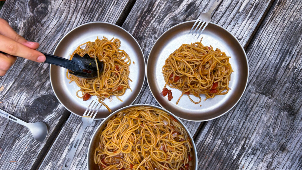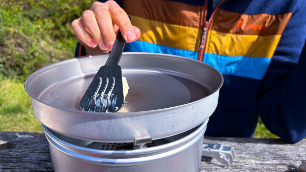 Am Ende hat ein gutes B-Waren-Angebot bei Trangia direkt bei der Entscheidung geholfen. Wir sind seitdem stolze Besitzer:innen eines Trangia 25 mit zwei Duossal-Töpfen und einer Pfanne. Nach eingehenden Praxistests sind wir mit unserer Materialwahl hochzufrieden. Duossal ist eine Kombination zweier Metalle. Während das Geschirr außen aus Aluminium besteht, das die Wärme gut leitet, ist es innen aus Edelstahl und damit kratzfest und hygienisch. Letztlich lässt sich damit kochen wie mit normalen Edelstahltöpfen. Mit etwas Vorsicht ist auch beim Anbraten in der Pfanne nichts angebrannt. Den Teflon-Varianten wird eine schlechte Haltbarkeit nachgesagt. Wer plant, viel anzubraten, ist damit aber wohl besser beraten, vor allem weil das Geschirr durch den darunterliegenden Brenner in der Mitte immer am heißesten wird.