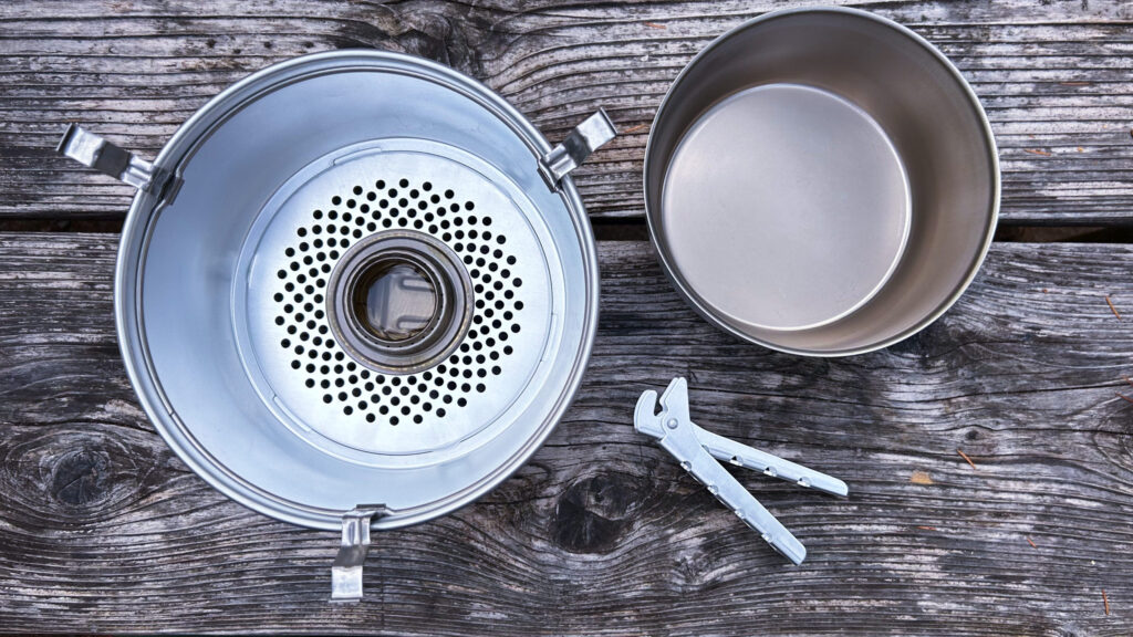 Nach dem Lösen des Gurts werden die Teile auseinandergenommen und der Brennerstand mit dem Windschutz zusammengesteckt. Der Brenner fasst 110 Milliliter Spiritus und brennt auf voller Flamme etwa 30 Minuten. Allerdings haben wir den Brenner nie ganz voll gemacht – laut Hersteller ist eine Befüllung bis 2/3 angeraten. Das hat uns für die meisten Gerichte ausgereicht, da wir den mitgelieferten Simmerring oft zur Reduzierung der Hitze eingesetzt haben. Dies hat die Brenndauer verlängert.